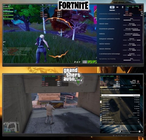 - Fortnite: Rozdzielczość Full HD, ogólne ustawienia grafiki na poziomie epickim/wysokim, średnia ilość FPS na poziomie 120.