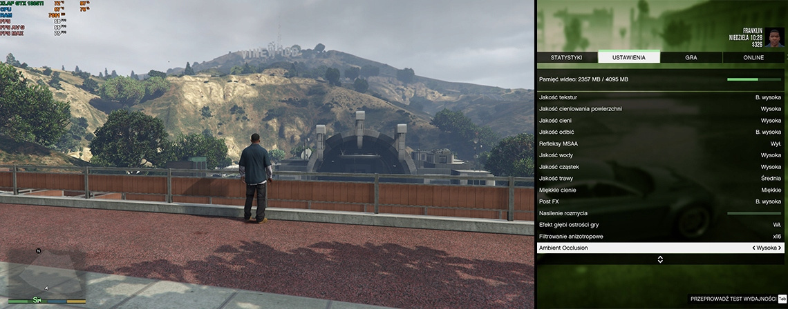 - GTA V: Rozdzielczość Full HD, ogólne ustawienia grafiki na poziomie wysokim, średnia ilość FPS na poziomie 66.