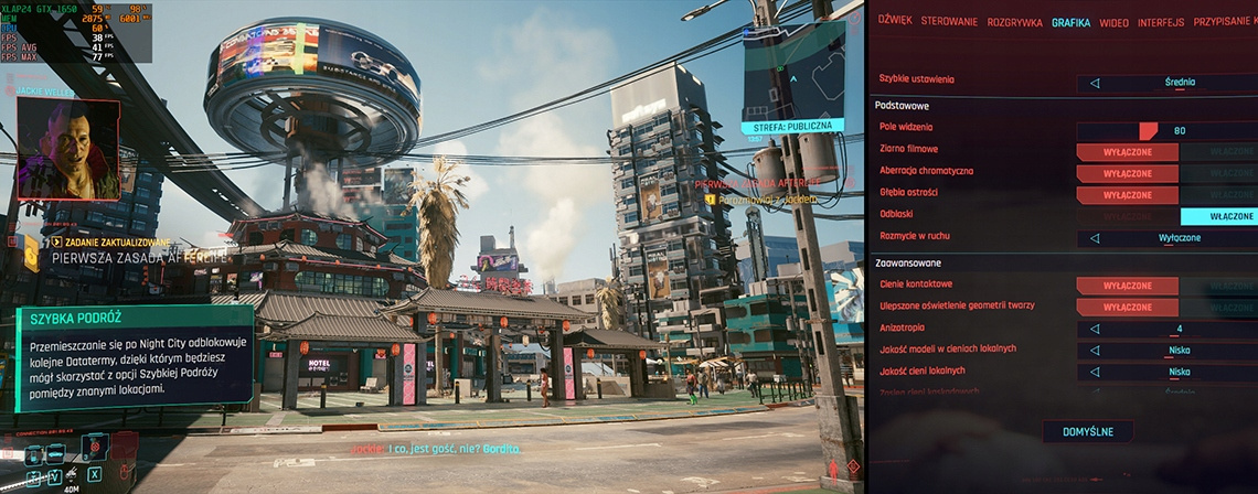 - Cyberpunk 2077: Rozdzielczość Full HD, ogólne ustawienia grafiki na poziomie średnim, średnia ilość FPS na poziomie 41.