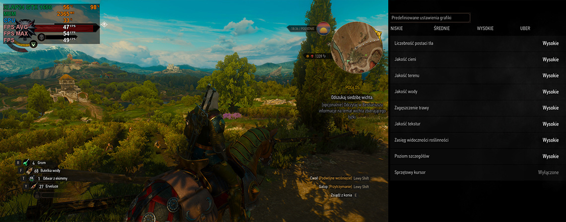- Wiedźmin 3: Rozdzielczość Full HD, ogólne ustawienia grafiki na poziomie wysokim, średnia ilość FPS na poziomie 47.